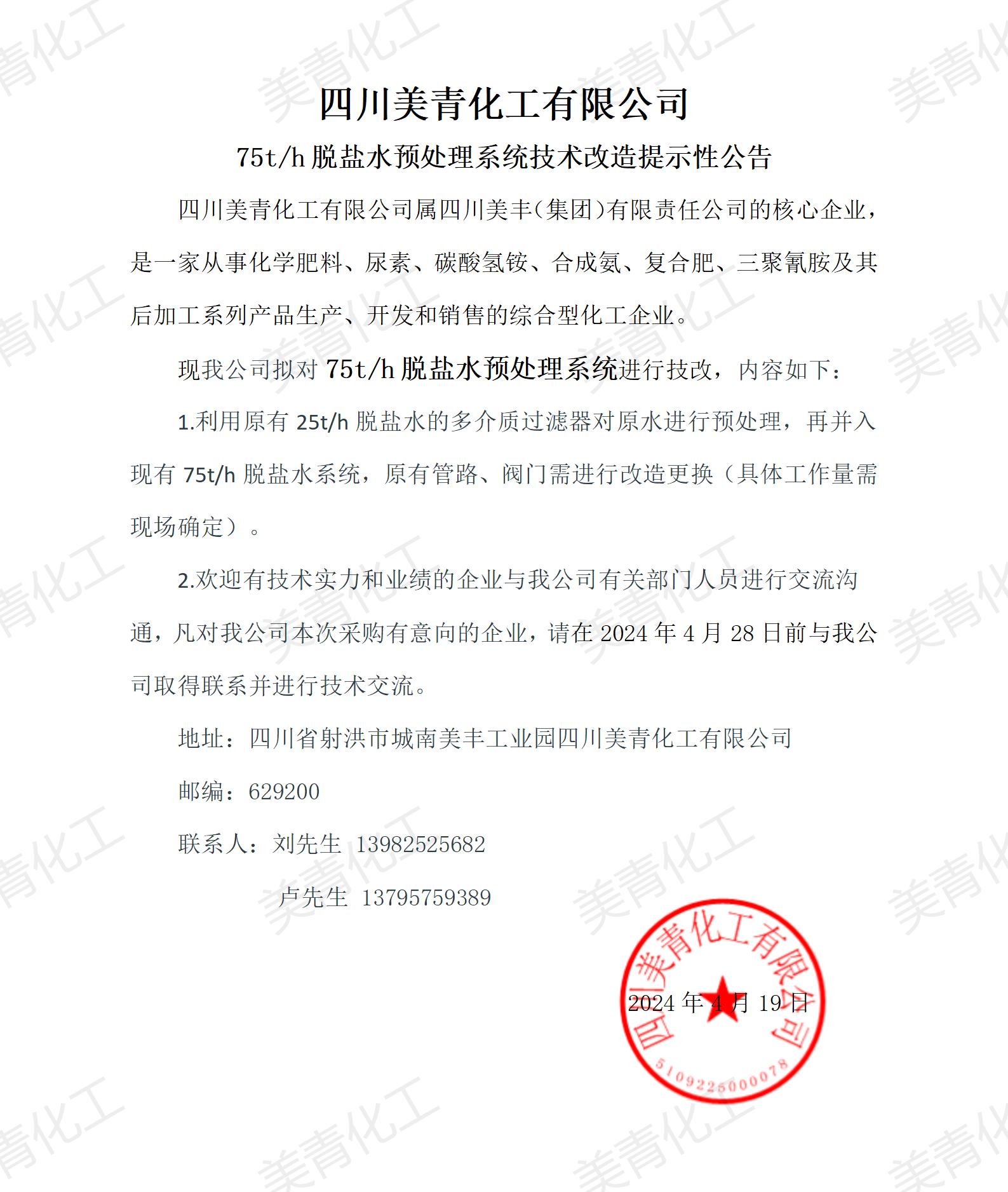 75t/h脫鹽水預(yù)處理系統(tǒng)技術(shù)改造提示性公告